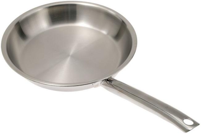 The Spring Brigade Premium frying pan has a diameter of 20 cm and a height of 3.4 cm. It’s ideal for frying meat and fish, for instance. The pan is designed to last for many years. The Spring frying pans from the Brigade Premium series are made of stainless steel and aluminium. These materials ensure that heat is absorbed and retained well. The aluminium core is protected by the closed stainless steel pouring rim, thereby preventing corrosion.